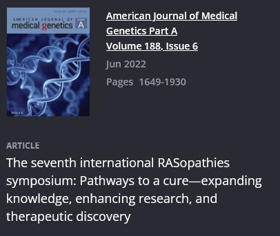 | "The seventh international RASopathies symposium: Pathways to a cure-expanding knowledge, enhancing research, and therapeutic discovery." Kontaridis MI, Roberts AE, Schill L, Schoyer L, Stronach B, Andelfinger G, Aoki Y, Axelrad ME, Bakker A, Bennett AM, Broniscer A, Castel P, Chang CA, Cyganek L, Das TK, den Hertog J, Galperin E, Garg S, Gelb BD, Gordon K, Green T, Gripp KW, Itkin M, Kiuru M, Korf BR, Livingstone JR, López-Juárez A, Magoulas PL, Mansour S, Milner T, Parker E, Pierpont EI, Plouffe K, Rauen KA, Shankar SP, Smith SB, Stevenson DA, Tartaglia M, Van R, Wagner ME, Ware SM, Zenker M. Am J Med Genet A. 2022 Jun;188(6):1915-1927. doi: 10.1002/ajmg.a.62716. Epub 2022 Mar 9. [ PubMed Link ] | [ Full text ] |